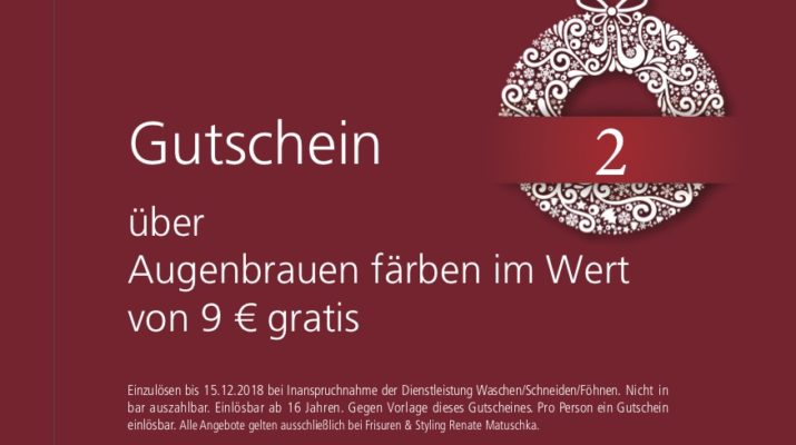Gutschein 2 über Augenbrauen färben im Wert von 9 € gratis Einzulösen bis 15.12.2018 bei Inanspruchnahme der Dienstleistung Waschen/Schneiden/Föhnen. Nicht in bar auszahlbar. Einlösbar